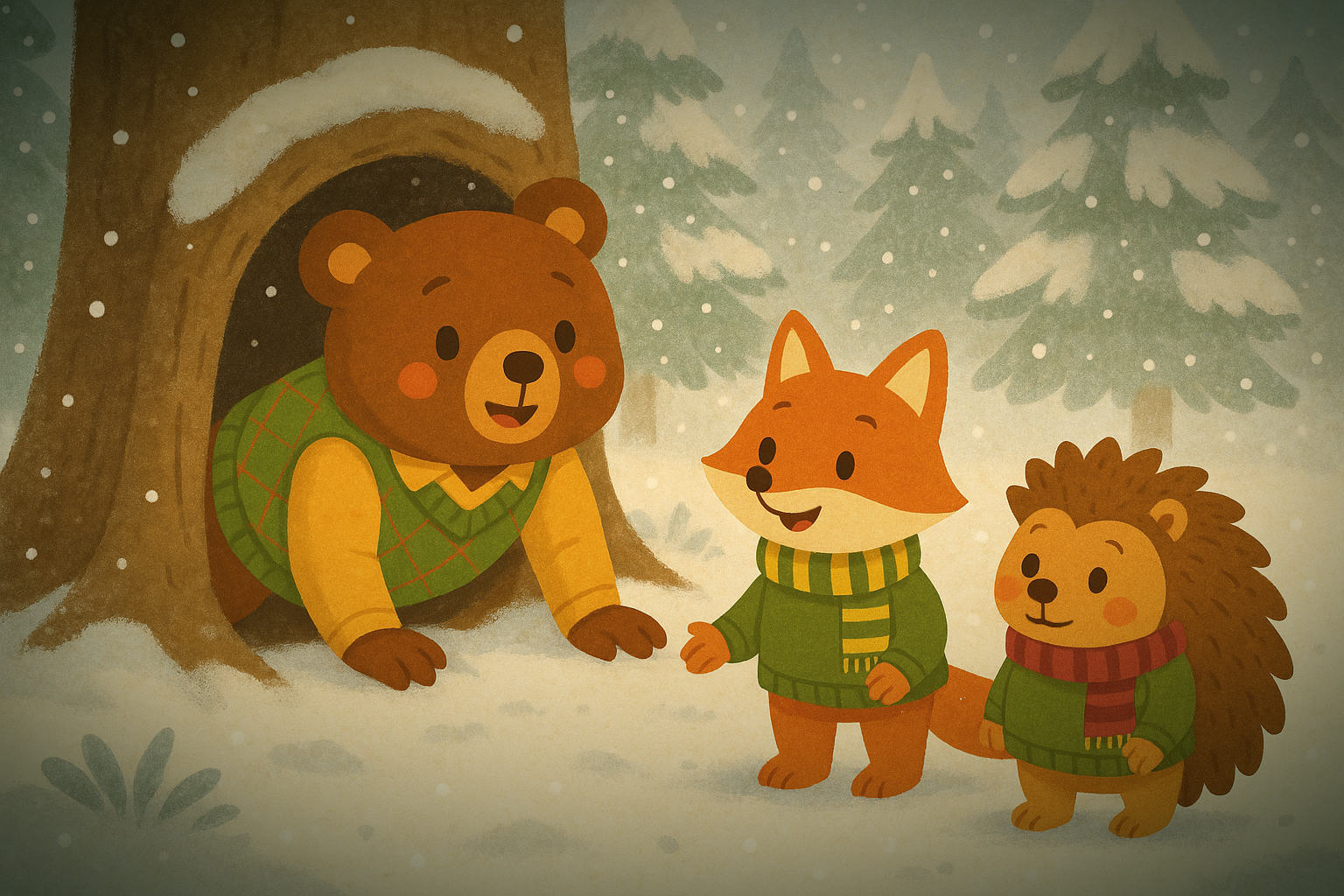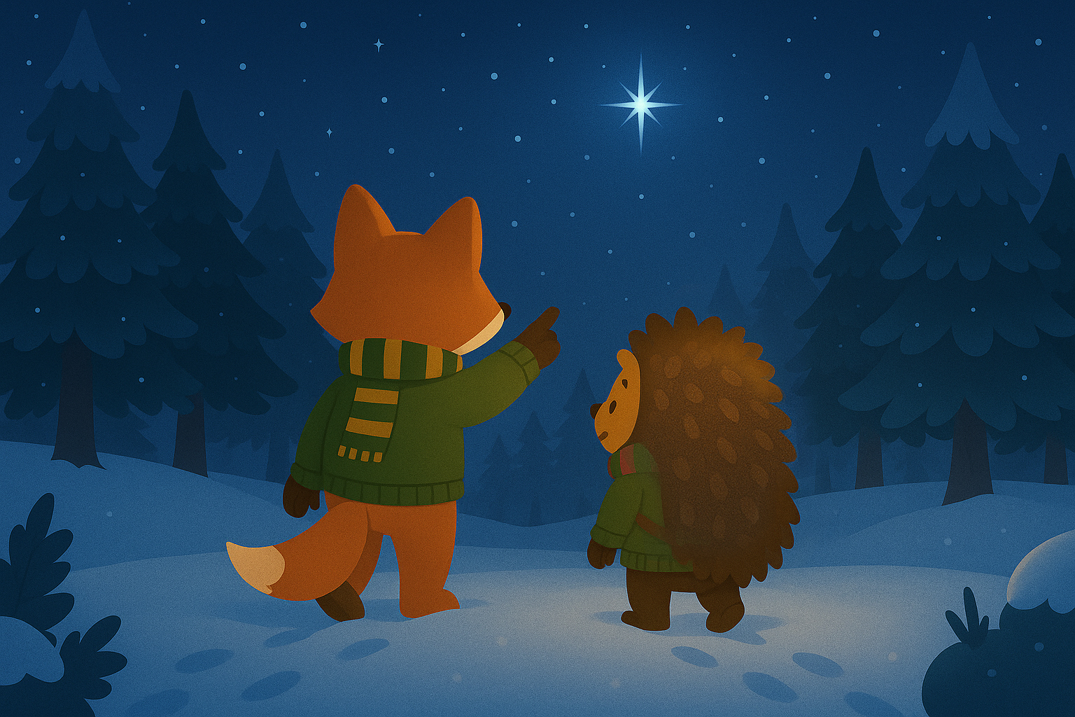 A puha hótakaró egyre vastagabb volt, ahogyan Bundi, a róka és Barka, a süni haladtak észak felé, hogy meglátogassák Bundi unokatestvérét. A csillagok fényesen ragyogtak az égen, mintha mindegyik ünneplőbe öltözött volna, vagy épp az utat szerették volna mutatni a két fős kis csapatnak.