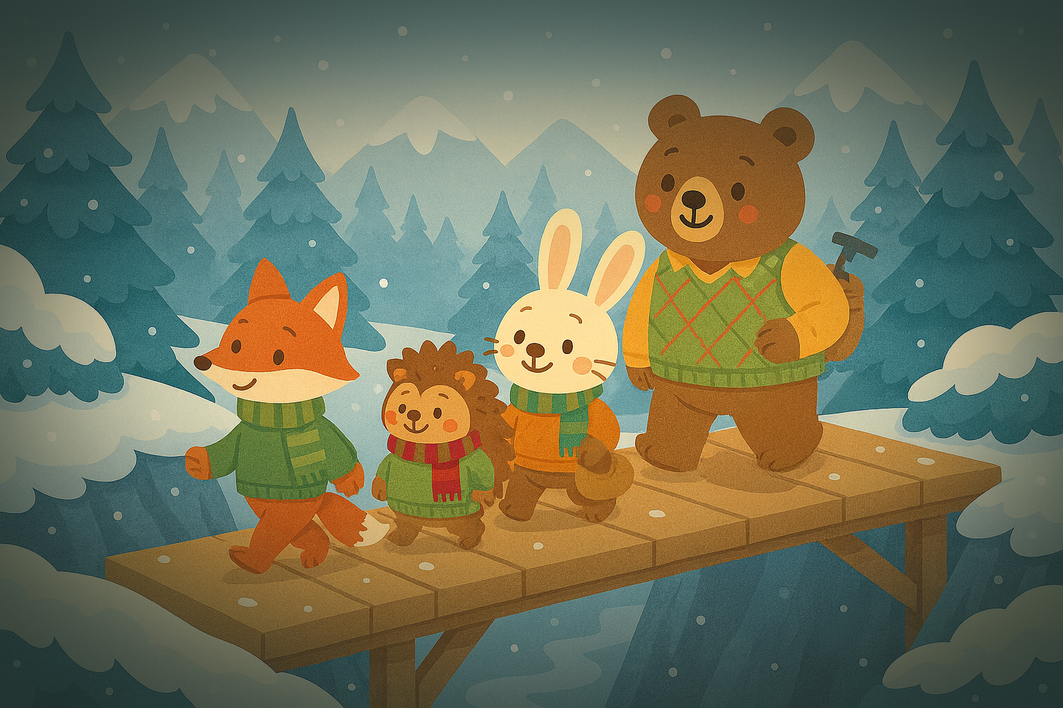 – Jót tesz egy kis testedzés a karácsonyi vacsora előtt! – simogatta meg a pocakját a falánk medve. Hoppla éles fogaival farigcsálta formára a fa darabkáit, Barka pedig minden elkészült lécet gondosan a helyére illesztett. Amikor az utolsó fadarab is a helyére került, és elkészült az új híd, a csapat üdvrivalgásban tört ki.