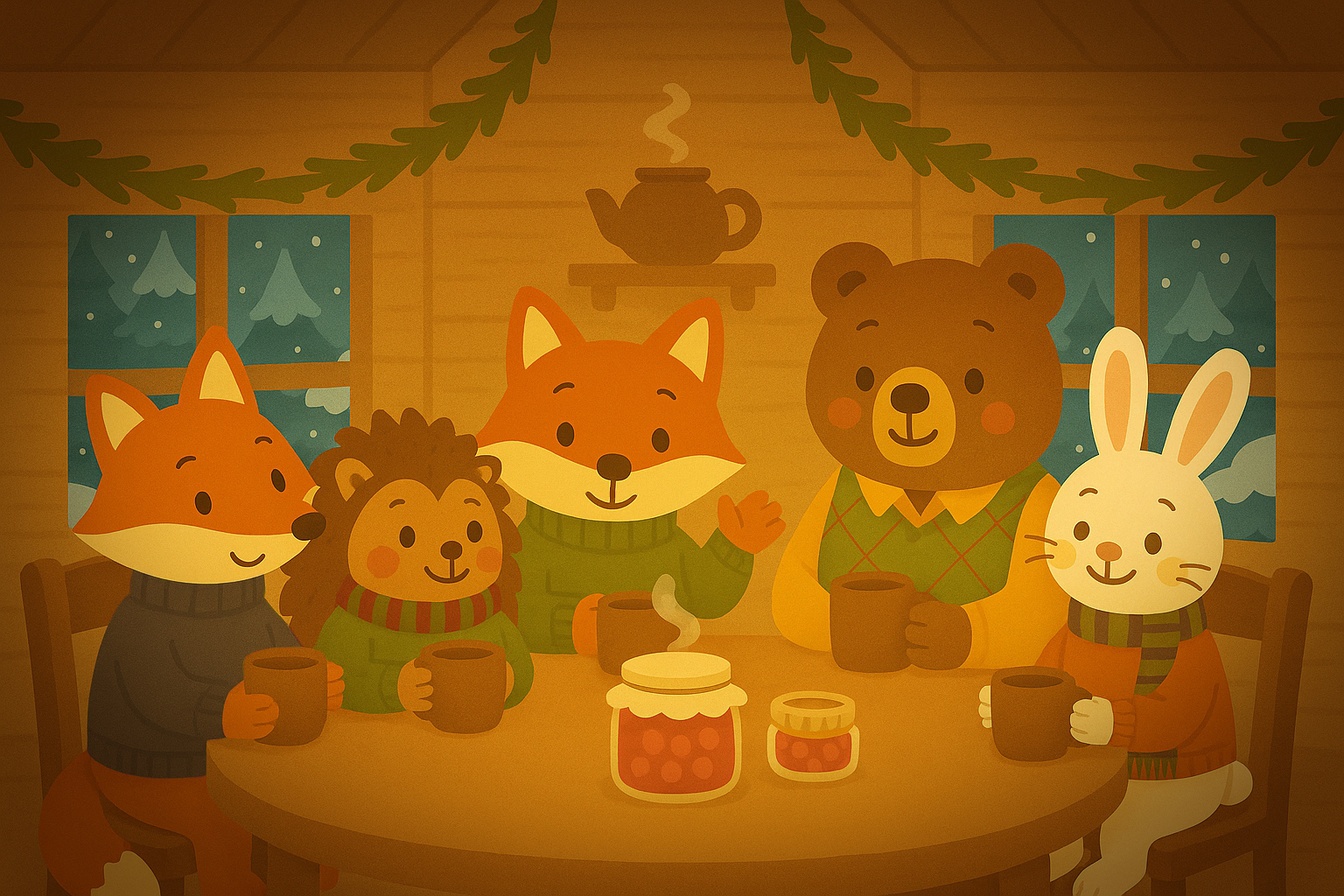 Az ablakon túl a sarki fény tovább ragyogott. Odabent pedig, a kandalló fényében és melegében két róka, egy süni, egy mackó és egy nyuszi osztoztak a karácsony élményén. Meghitt hangulatban, igaz barátokként.